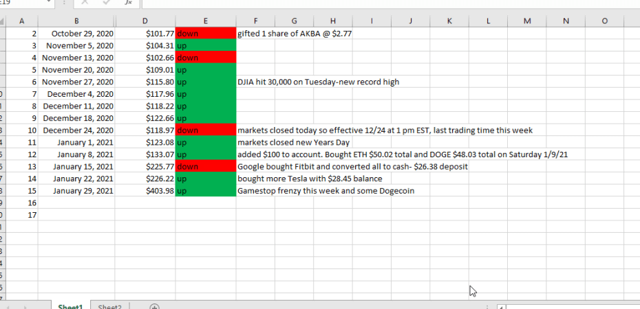 Luckily for me, Thursday night started another rally of Dogecoin, which effectively raised my overall portfolio above $530 at one point. By Friday evening, it was hovering just above $400, which is still double than what I put into it 15 weeks ago.